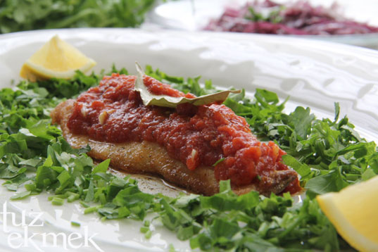 Kızartılan balıklar önce kağıt havluya sonra servis tabağına alınır ve üzerine domates sos gezdirilir üzerine ve etrafına maydanoz serpilir.