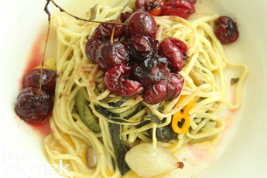 Bu arada bir tavaya tereyağı ve ıtır dalı alınıp tereyağı eriyene kadar beklenir üzerine vişneler bırakılır ve suyu çıkıp birazcık da karamelize olana kadar kavrulur. Üzerine en son karabiber serpilir. Ateşten alınır.