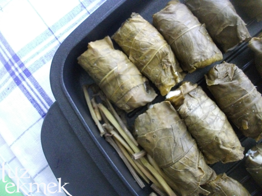 Yaprak dolması sarar gibi biraz kalınca sarılır ve bir fırın tepsisine dizilir.