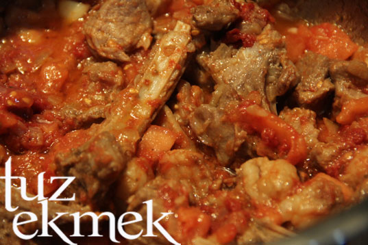 Sotelenen etin üzerine domates ve salça ilave edilip suyunu çekip uygun bir kıvama gelince üzerine sıcak su ilave edilir.