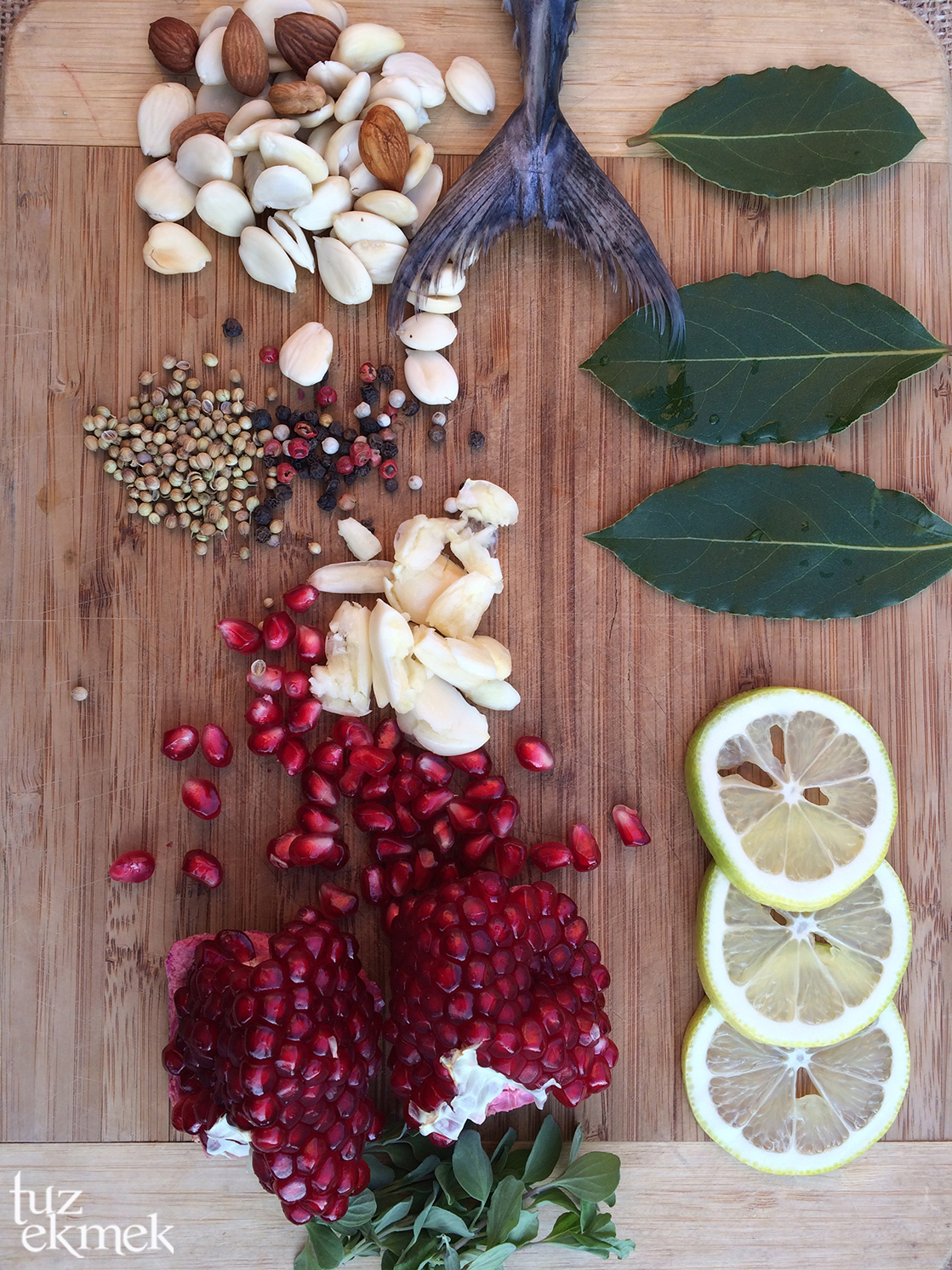 İçi için; balığın büyüklüğüne göre tanelenen nar, kıyılmış badem, bıçakla kıyılmış sarımsak, tane kişniş ve karabiber, mercanköşk, limon dilimleri, defne yaprakları, kalan zeytinyağı ve tuz karabiber ilave edilip harmanlanır.