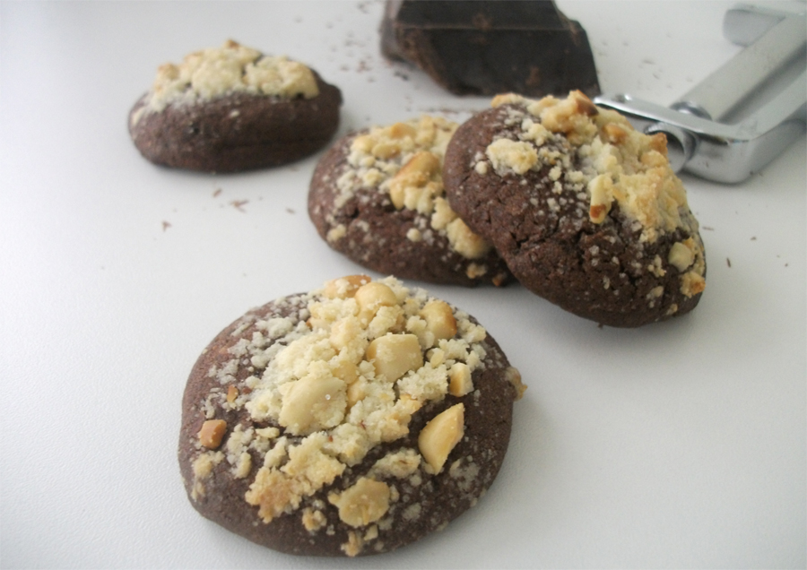 Büyükçe bir kapta mikser yardımıyla pudra şekeri, tereyağı, ve yer fıstığı ezmesi krema haline getirilir. Yumurta ilave edilir, tekrar mikserle karıştırılır. Üzerine eleme kabında topladığımız un, kakao elenir ve kakule tozları katılır. Kabartma tozu ve karbonat dökülür ve üzerine birkaç damla limon damlatılır( turunç damlattım- turunçlar, nefis sulanmaya başladılar, salatalarda kullanmaya başladım). Tekrar mikserle karıştırılıp yağlı karışımın unlu malzemeleri alması sağlanır. Bu aşamaya kadar mikser kullandım. Çikolata kırıkları da katılıp, elle yumuşak hareketlerle yoğrulur. Hamur yumuşak oluyor(ama yuvarlanabiliyor) ve elinize yapışabilir. Sakın un ilave edip, katı bir hamur elde etmeyin(kulak memesinden daha yumuşak). Verilen miktarlara dikkat edilirse müthiş bir uyum ortaya çıkıyor.