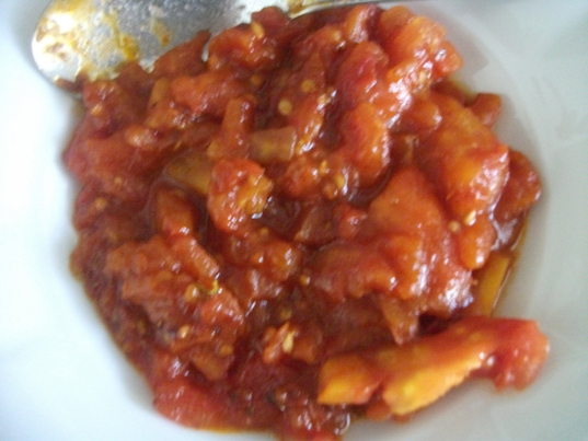 Sotelenmiş sarımsakların üzerine soyulmuş ve küp şeklinde doğranmış 2adet domatesi – fazla çekirdeklerini atın, lütfen- ve incecik kıyılmış acı biber atılır yüksek ateşte suyunu bırakmasına fırsat vermeden sotelenir. Üzerine mercanköşk, karabiber ve tuz serpilir.