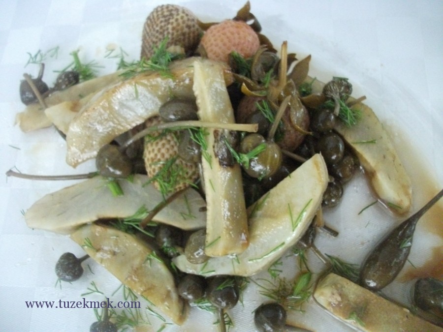 Bu salatayı da kapari ve çilek turşumu, kalan son enginarlarımı limonlu su ile kıtırlığını geçirmeden haşladım ve hepsini bir araya getirdim. Üzerine de az nar ekşisi, az limon suyu ve birazcık da sızma gezdiriverdim. Dereotunu da incecik kıyıp üzerine serptim. Çok güzel oldu.