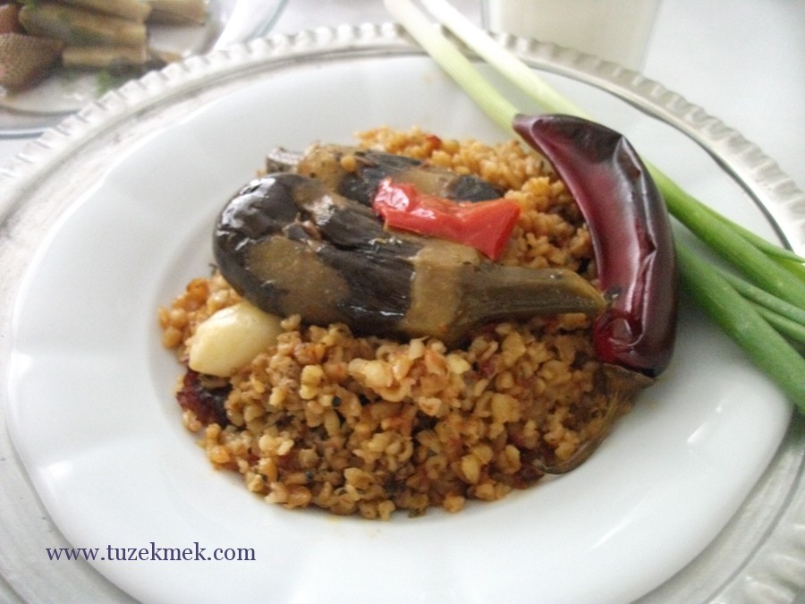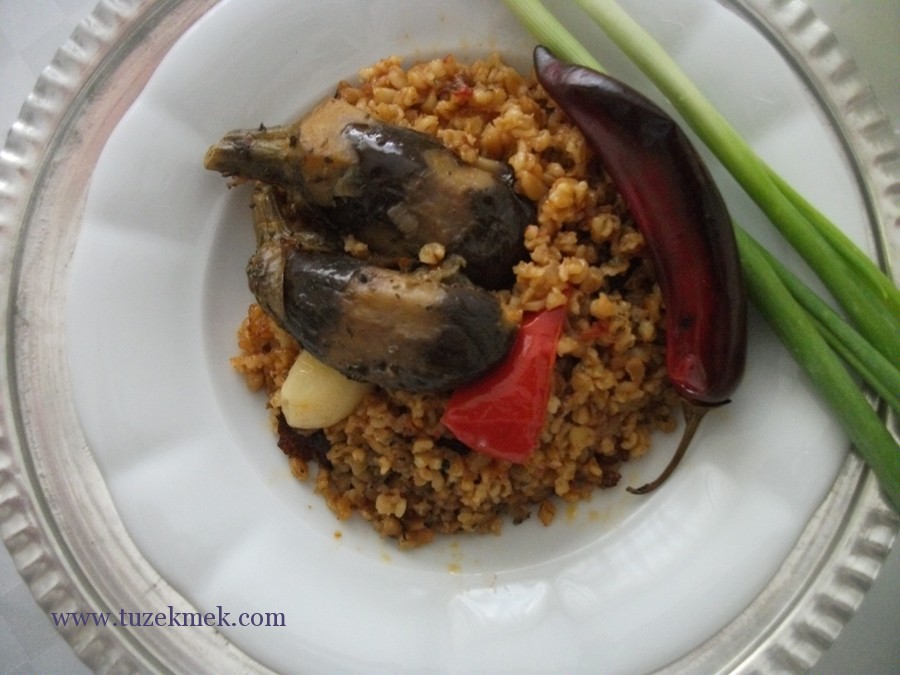 Kavrulan bulgurun üzerine patlıcanlar, tuz ve sıcak su dökülüp önce orta sonra düşük ateşte pişirilir.