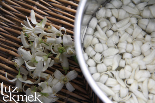Portakal çiçeklerinin taç yaprakları temizlenir yıkanır ve süzülür.