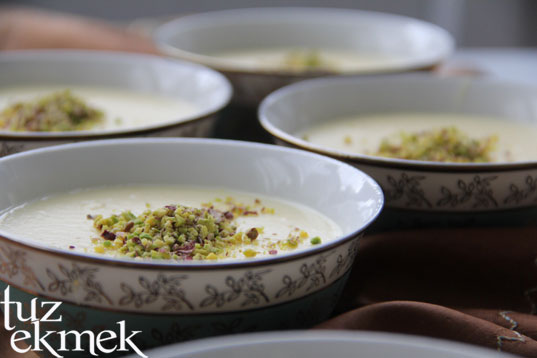 Muhallebiye kaymak ilave edilir ve mikserle en az 5 ‘ çırpılır ve yüksekten tutarak kaselere paylaştırılır.