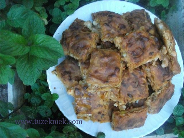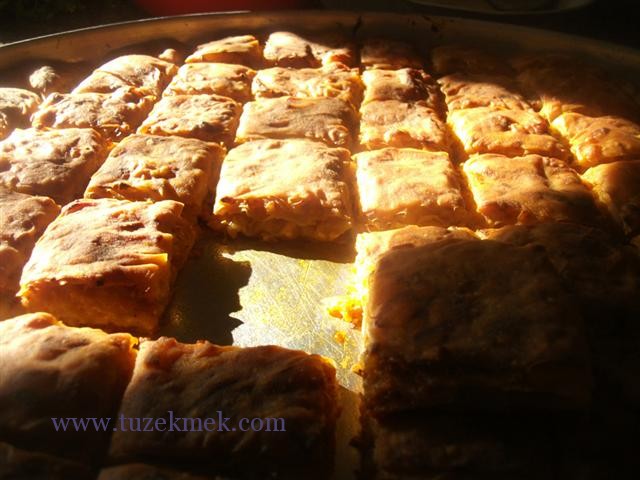 Dinlendirilen hamur önce pazı yapılır ve tepsi büyüklüğünde açılır. İki kat hamur bir kat iç şeklinde yapılır.