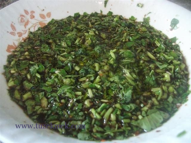 Çukur bir kaseye azcık tuz ile dövülmüş sarımsak, nar ekşisi, zeytinyağı ve su ilave edilip karıştırılır suyu az gelirse biraz daha su ilave edilir ve üzerine kıyılmış su tereleri ilave edilir ve karıştırılır.