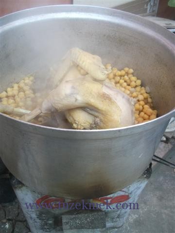 Biz bu işlemi bahçede yaktığımız maltız ocağı üzerinde yaptık. Etin lezzeti doyulmazdı. İçinde tavukla birlikte haşlanan nohutlardan biraz aldık ve suyuna da pilav saldık.
