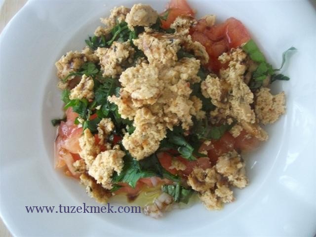 Salatayı yapacağımız çukur bir kâseye altta soğanlar olmak üzere incecik ve küçük küpler şeklinde doğranmış domatesler ve ufalanmış peynir ilave edilir.