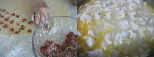 Tezgâhta veya  hamur açma tahtasında hamur büyüklüğüne göre 2-3 parçaya bölünür ve mantı yufkası kalınlığında açılır. Açılan hamur 1,5-2 cmlik kareler kesilir ve mantı gibi ortalarına uygun miktarda et koyup mantı gibi bükülür.
