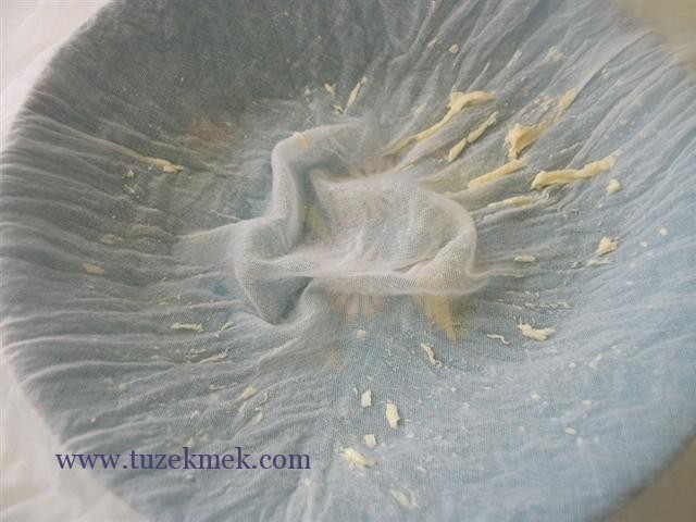 Bir süzgeç üzerine hazırlanan tülbent serilir ve hafifçe karıştırılan kesilmiş süt dökülür ve peynir altı suyunun bir kaba akması sağlanır. Bu suyu lütfen ziyan etmeyin. Ekmek, kek, poğaça yaparken kullanabilirsiniz.