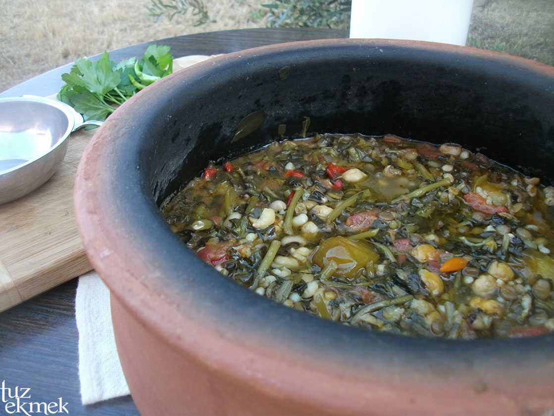 Kavrulan salçalı ete, süzdürülmüş semizotu ilave edilip üzerine bulgur ve mercimek ilave edilir. Üzerine kalan domates suyu da katılıp bir süre pişmesi ve semizotunun suyunu salması sağlanır.