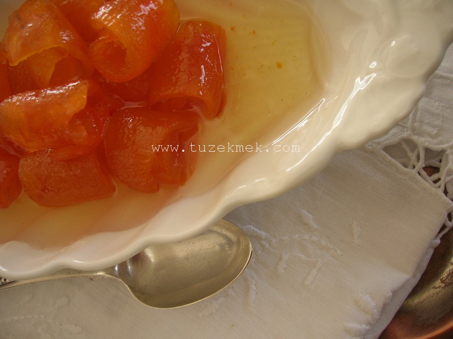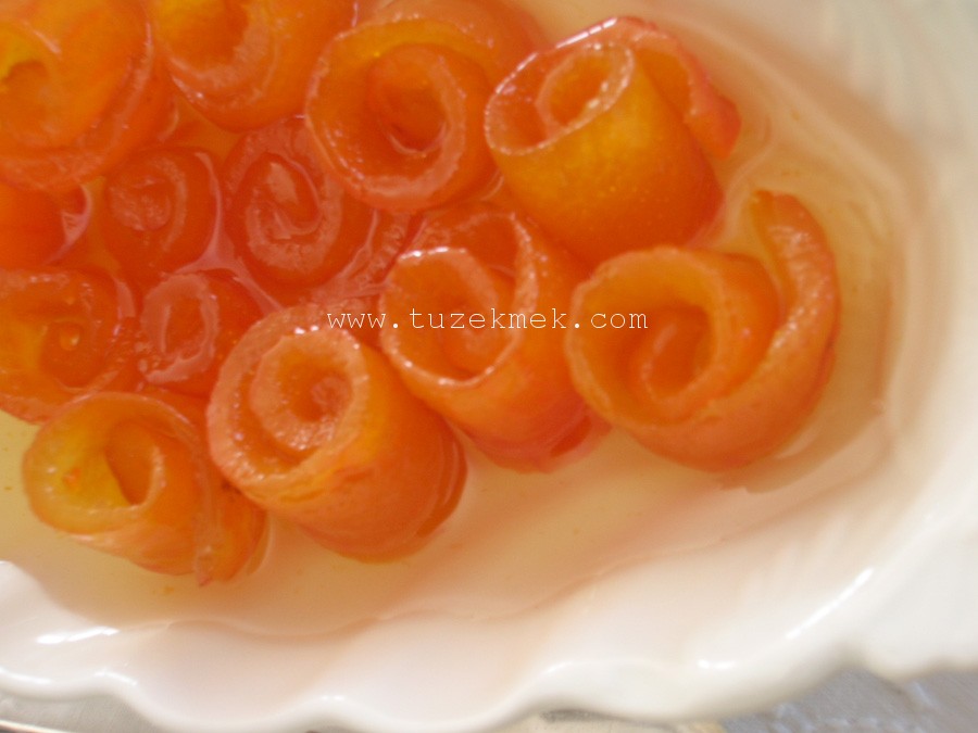 Not: Bu reçeldeki meyve kabuklarını yazın parfe, dondurmalarda ve yine uygun keklerde kullanıyorum.