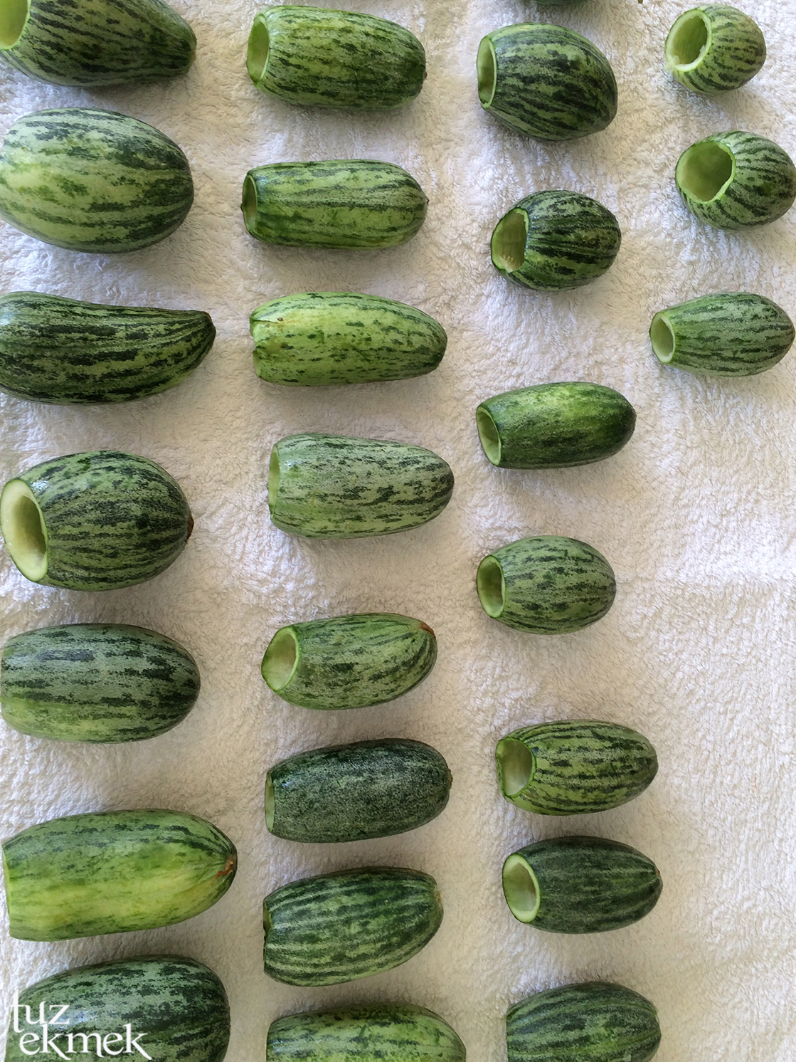 Baş kısmı birazcık kesilip sebze oyacağı ile içindeki çekirdek kısmı güzelce temizlenip uygun bir kaşıklada içinin şekli düzeltilir.