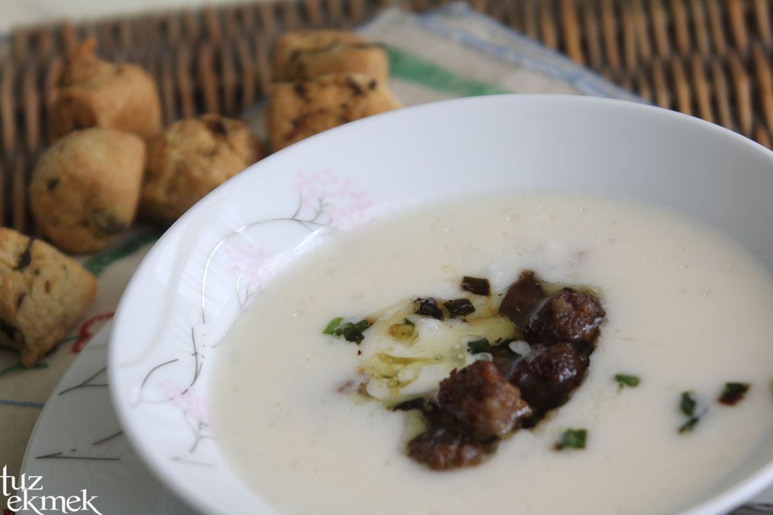 TuzEkmek çorbalarının içinde köfteli bir çorba daha bulabilirsiniz,  o da Erzurum’un Ayran Aşı çorbası.  İçindeki mis gibi kişniş otuyla yemelere doyulmaz. Ondan esinlenerek bu çorbada, nane yakılıp yapılan sosun yerine taze soğanı karamelize edip kullandım
