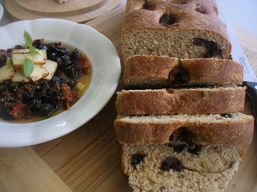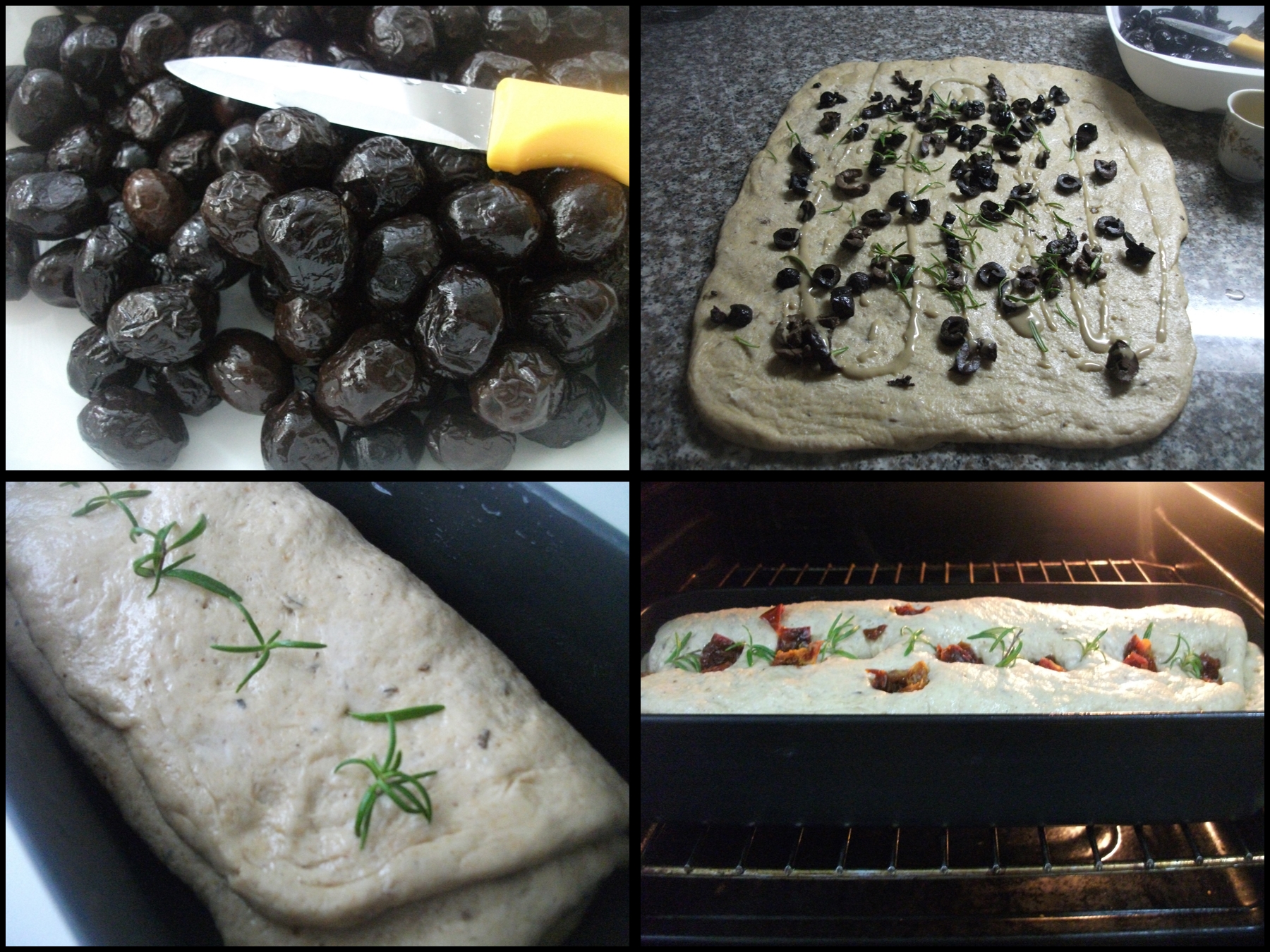 Açılanan hamurun üzerine kıyılmış zeytinlere, taze biberiye(kurusu da olur) ve tahin gezdirilir ve kalıbın ölçüsünde üçe katlanır ve pişirme kabına alınır. Zeytinli yaptığımda ekmeğin üzerine önceden ıslatıp, yumuşattığım domates kurusunu ve taze biberiye ilave ettim.