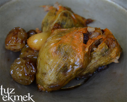 Kabak çiçeklerinin içine yarısını pek geçmeyecek kadar iç doldurulup taç yapraklar üst üste getirililerek kapatılır. Hepsi aynı şeklilde yapılıp tenceredeki eriklerin üzerine dizilir. Üzerine kalan zeytinyağı ile 1/3 Türk kahvesi fincanı su gezdirilir.