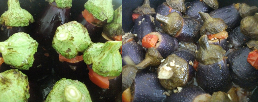 Patlıcanların üzerine domates dilimleri ilave edebilirsiniz, ben patlıcanın başını da atmayıp, ikisini de kullandım.