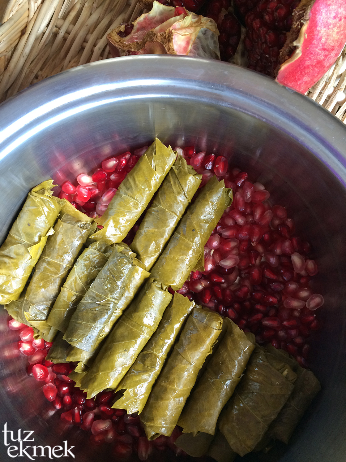 Sarmaları dizeceğimiz tencerenin alt kısmına 1cm kalınlığında nar taneleri serilip üzerine sarmalar dizilir.